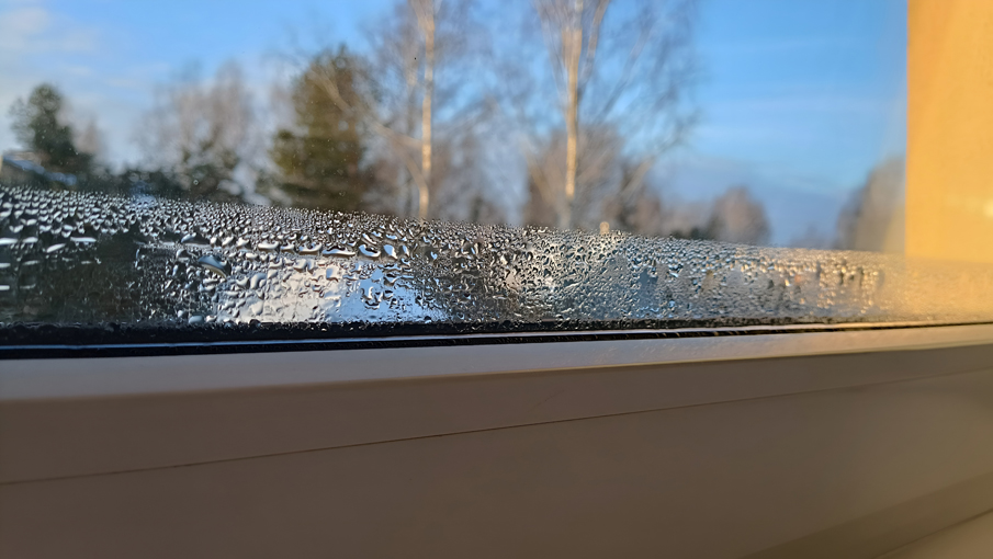 Drops of condensation on the metal-plastic window. Fragment of a plastic window with water condensation on the glass, temperature difference, humidity in the room, humidity problem.